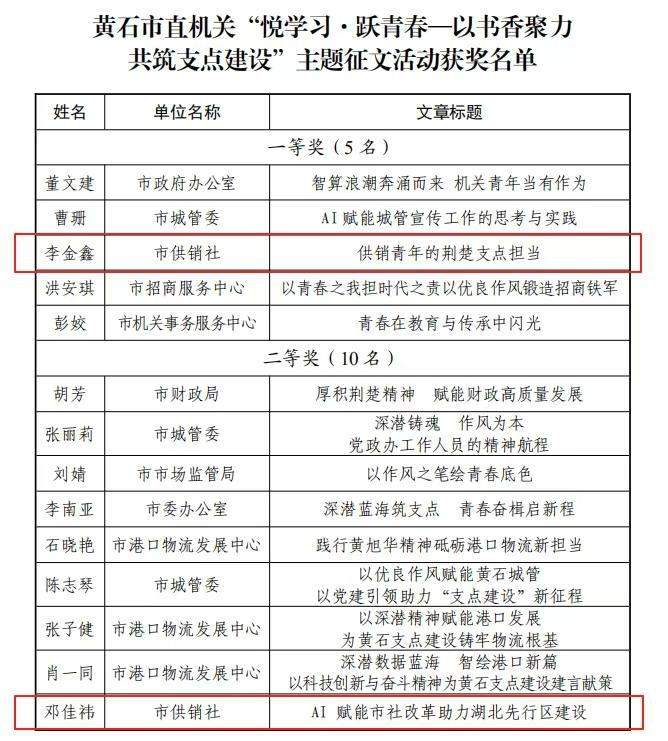 近日,共青团黄石市直机关工作委员会印发“悦学习·跃青春—以书香聚力 共筑支点建设”主题征文活动获奖情况通报,我社两名青年干部斩获荣誉,其中李金鑫同志撰写的《供销青年的荆楚支点担当》获一等奖,邓佳祎同志撰写的《AI赋能市社改革助力湖北先行区建设》获二等奖。