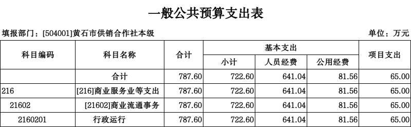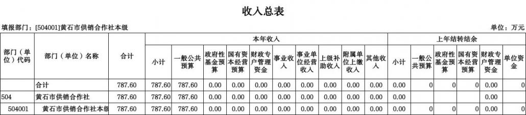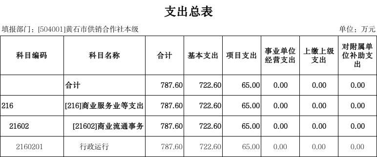 按照综合预算的原则,黄石市供销社所有收入和支出均纳入部门预算管理。收入包括:一般公共预算拨款收入;支出包括:商业服务业等支出;2026年度收支总预算787.6万元。