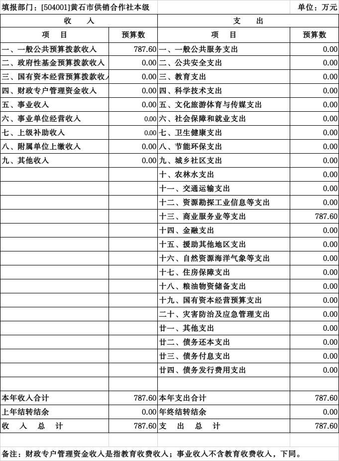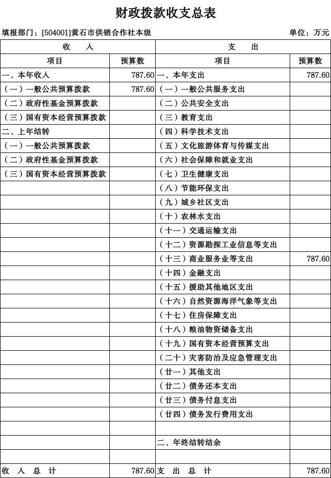 按照综合预算的原则,黄石市供销社所有收入和支出均纳入部门预算管理。收入包括:一般公共预算拨款收入;支出包括:商业服务业等支出;2026年度收支总预算787.6万元。