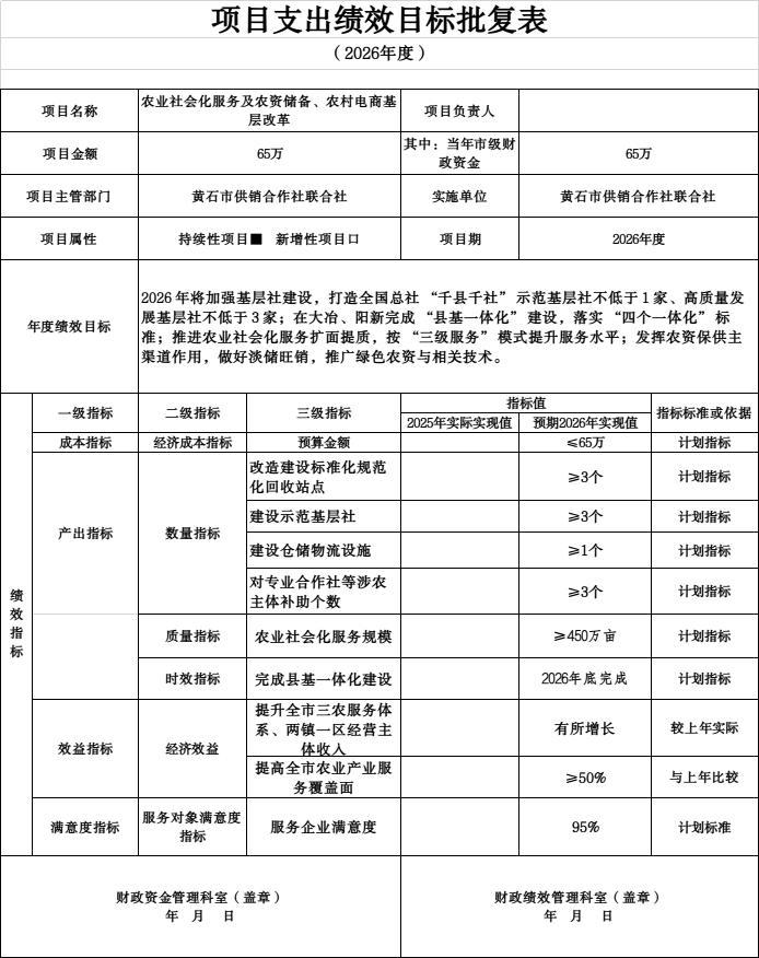 (7)2026年度项目绩效总目标是:一是加强基层社建设,打造全国总社“千县千社”示范基层社不低于1家,打造高质量发展基层社不低于3家。二是2026年推进“县基一体化”建设。在大冶、阳新完成“县基一体化”建设,落实“人员调配、资产监管、财务管理、经营服务”四个一体化标准。三是2026年重点推进“农业社会化服务扩面提质工程”,按照“县域三农服务运营中心+乡村三农服务中心+村级综合服务设”建设模式,提升我市供销社农业社会化服务水平。四是发挥好农资保供主渠道作用。积极做好农资淡储旺销工作,保障农资基本供应,大力实施绿色农资升级行动,深入推进化肥农药减量增效,加大绿色农资销售力度,大力开展测土配方施肥绿色防控技术推广。