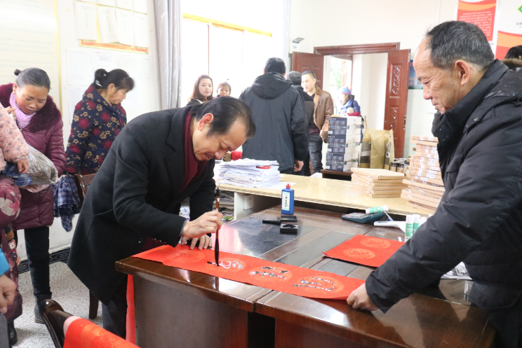 三是书写春联送祝福。市社组织系统内的书法爱好者自带笔墨纸砚,现场创作了十余条春联,有的被来购买物资的群众自主领取,有的由包保干部直接送到了贫困户的家中,喜庆的对联饱含着祝福,在微寒的季节,为村民家中增添了几许温暖和春色。
