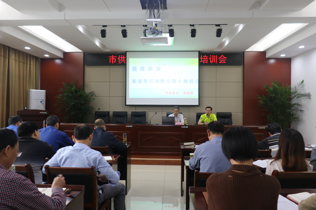 为深入学习贯彻习近平新时代中国特色社会主义思想特别是扶贫开发战略思想,进一步加深市社系统党员干部对精准扶贫、精准脱贫工作的认识,提高干部职工在扶贫方面的业务水平和工作能力,为我市打赢打好脱贫攻坚战提供坚实保障,4月24日,市供销社组织召开脱贫攻坚专题培训会,邀请市扶贫办副调研员黄晓辉同志进行讲座,市社机关全体党员干部、驻村工作队队员、各基层单位全体职工共五十余人参加培训。
