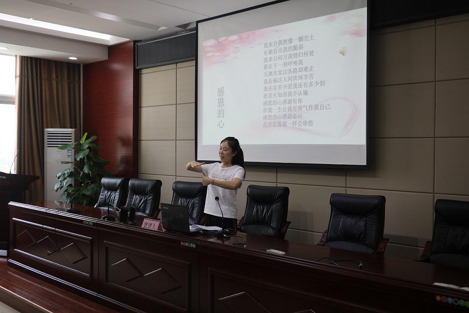 活动按照“省自身、唱歌曲、看短片、诵经典、讲故事、谈感悟、送祝福、做善事”八个环节规范开展。在唱歌曲环节,李信欣还现场教了大家一段歌曲《感恩的心》的手语舞,大家都起身跟着比划,充分调动起了讲堂的互动氛围。