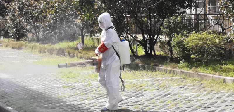下午2点整,消杀设备的嗡嗡声,在团结社区四个片区内响起,62名救援队员和“双报到”党员、志愿者分头对各楼栋、小区公共场地等处开展消杀。