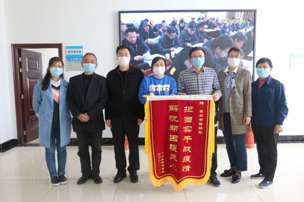 4月14日上午,下陆区团结社区书记姚卫萍与社区老党员一行4人,为黄石市供销社送来一面“担当实干战疫情 解忧帮困暖民心”的锦旗,对市供销社在疫情防控期间为社区居民提供的真情帮助和辛勤付出表示由衷的感谢。