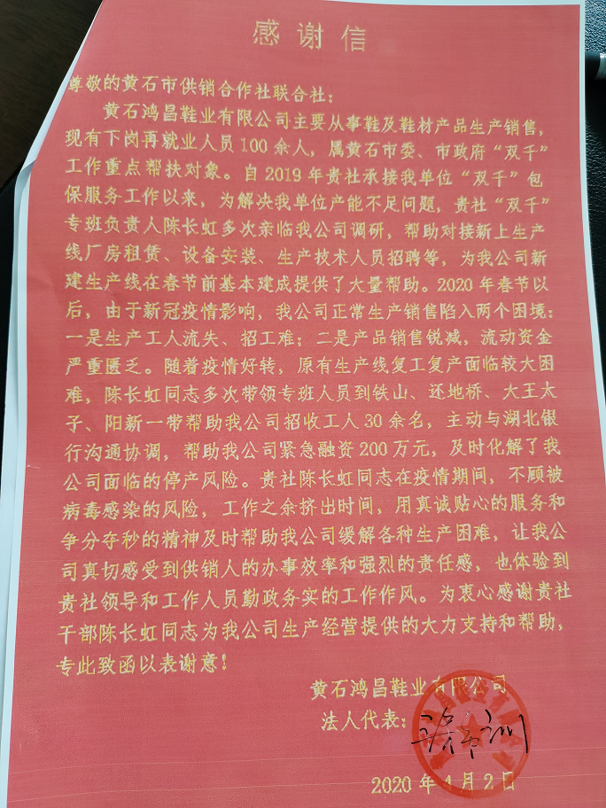 黄石鸿昌鞋业有限公司主要从事鞋及鞋材产品生产销售,现有下岗再就业人员100余人,属黄石市委、市政府“双千”工作重点帮扶对象。自2019年贵社承接我单位“双千”包保服务工作以来,为解决我单位产能不足问题,贵社“双千”专班负责人陈长虹多次亲临我公司调研,帮助对新上生产线厂房租赁、设备安装、生产技术人员招聘等,为我公司新建生产线在春节前基本建成提供了大量帮助。2020年春节以来,由于新冠疫情影响,我公司正常生产销售陷入两个困境:一是生产工人流失、招工能;二是产品销售锐减,流动资金严重匮乏。随着疫情好转,原有生产线复工复产面临较大困难,陈长虹同志多次带领专班人员到铁山、还地桥、大王太子、阳新一带帮助我公司招收工人30余名,主动与湖北银行沟通协调,帮助我公司紧急融资200万,及时化解了我公司面临的停产风险。贵社陈长虹同志在疫情期间,不顾被病毒感染的风险,工作之余挤出时间,用真诚贴心的服务和争分夺秒的精神及时帮助我公司缓解各种生产困难,让我公司真切感受到供销人的办事效率和强烈的责任感,也体验到贵社领导和工作人员勤政务实的工作作风。为衷心感谢贵社干部陈长虹同志为我公司生产经营提供的大力支持和帮助,专此致函以表谢意!