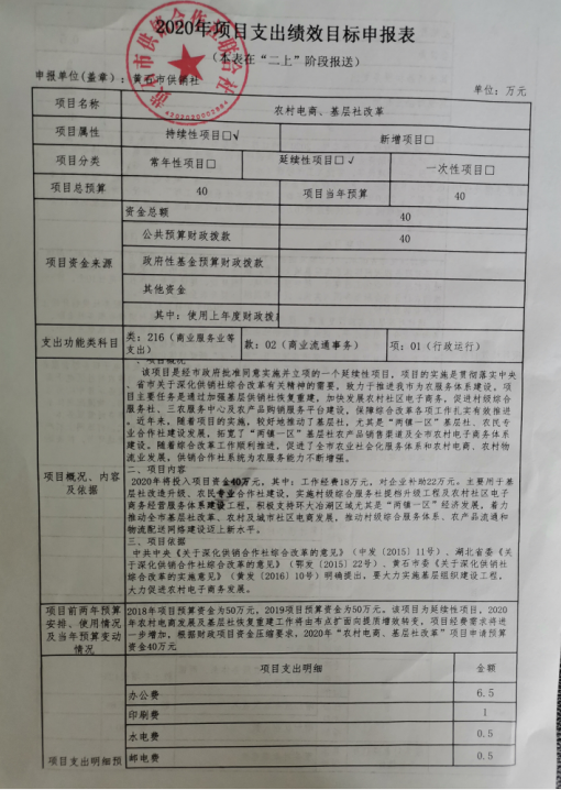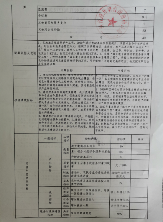 2020年本部门(单位)共有一个项目,即农村电商、基层社改革项目,该项目为延续性项目,于2017年经市政府批准立项。项目主要任务是通过加强基层供销社恢复重建,加快发展农村社区电子商务,促进村级综合服务社、三农服务中心及农产品购销服务平台建设,保障综合改革各项工作扎实有效推进。2020年该项目总预算40万元,较2019年减少10万元,主要原因是根据财政厉行节约的原则,2020年项目预算压缩20%。该项目绩效目标如下图(因项目年度总预算小于50万元,无财政绩效目标批复):