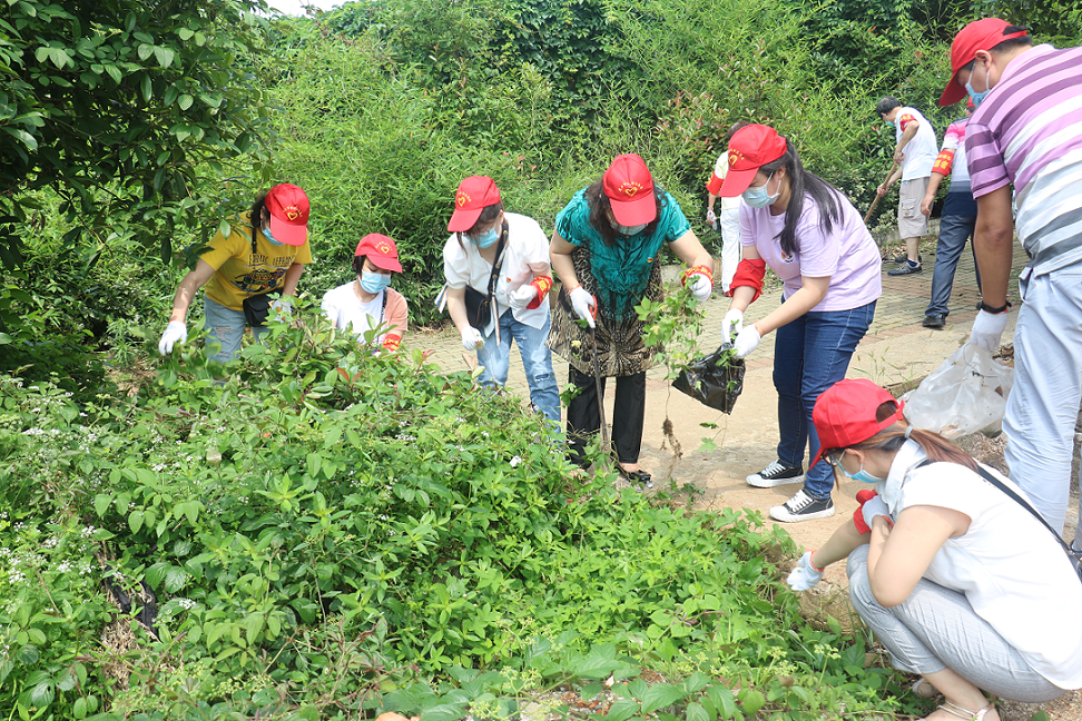 随后,现场党员干部前往骆驼山运动场附近开展集体志愿服务活动。烈日炎炎下,党员干部充分发扬不怕脏、不怕累的精神,手拿铲子和夹子,认真清理上山步道的花坛内垃圾和路边杂草,对于不便清理的杂物,有的同志还直接用手进行抱拾。经过近1个小时的劳动,共清运垃圾5筐,所有人也早已被汗水浸湿了衣衫。