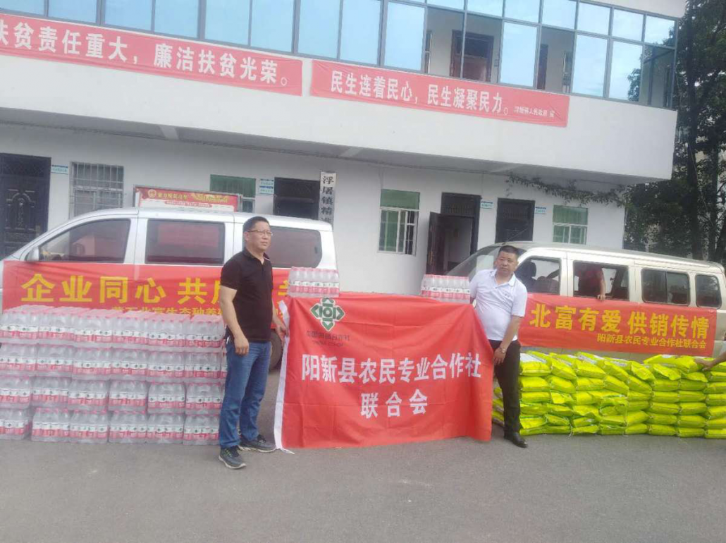 (阳新县供销社领办的农民专业合作社联合会捐赠大米、矿泉水等救灾物资)